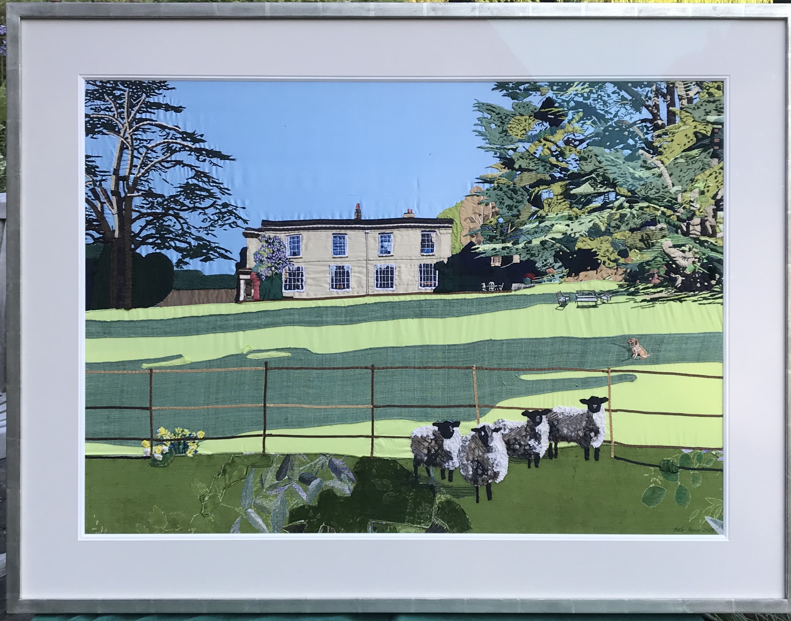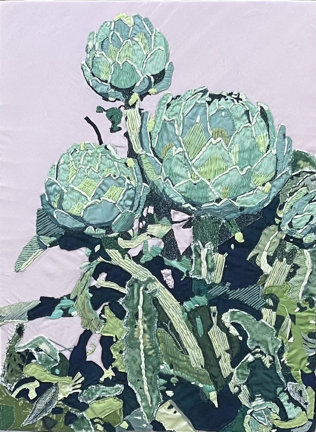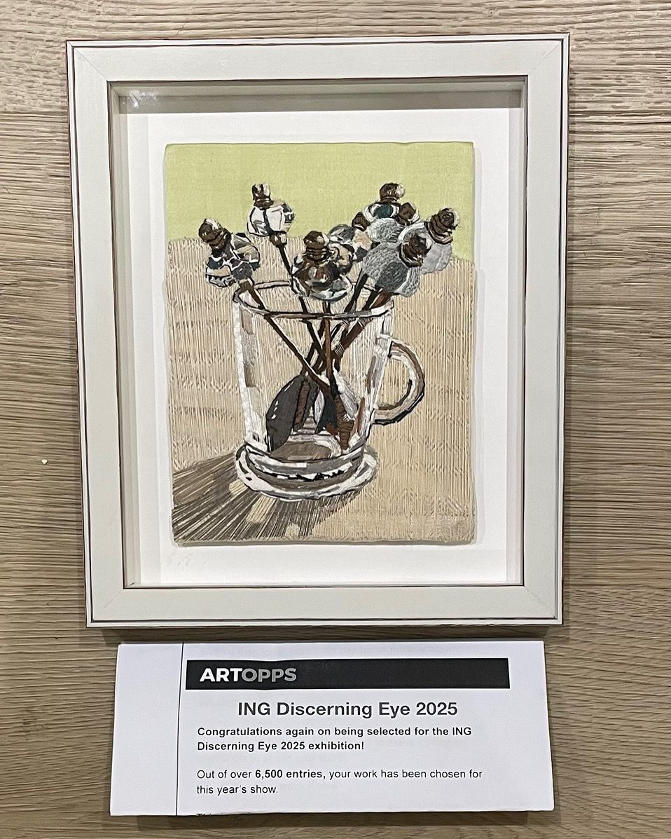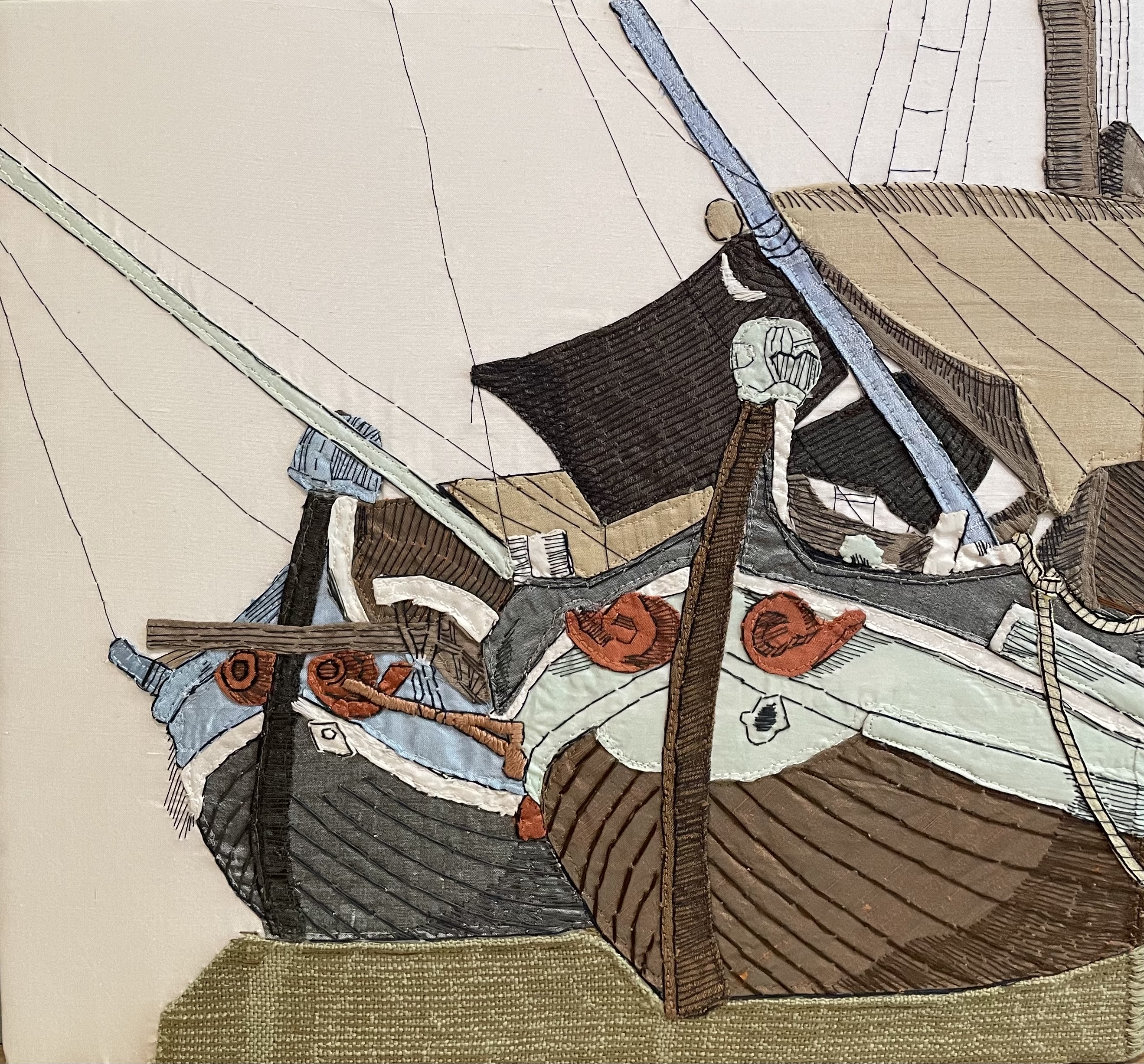 Fabric collage made from silk and other remnants . I was inspired by these crystal spoons in glass in my brother’s house in france .