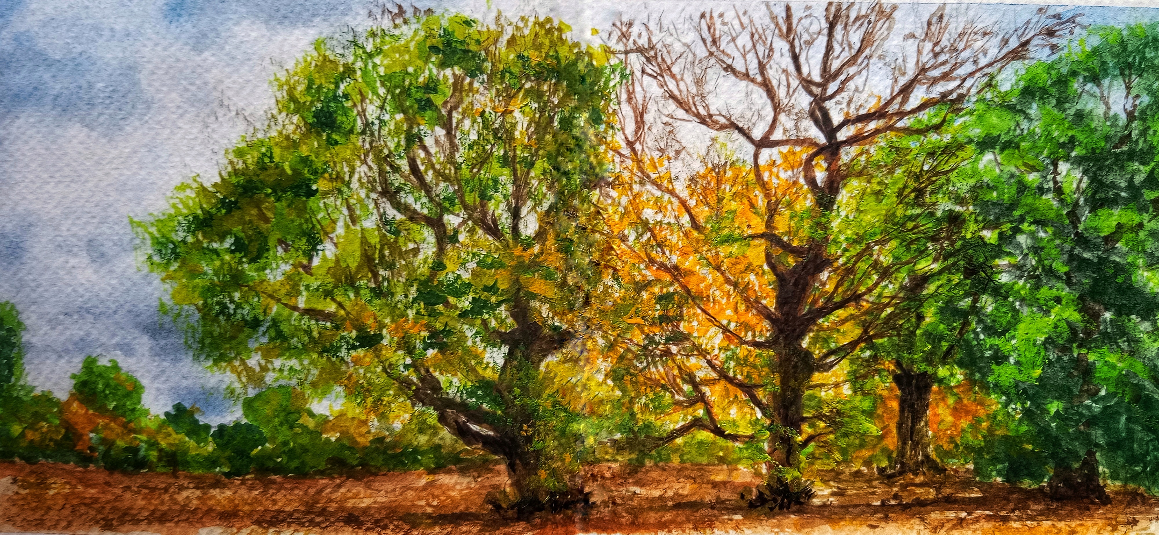 Small sketchbook watercolor spread. Autumn is starting to influence the landscape of the village farm.
