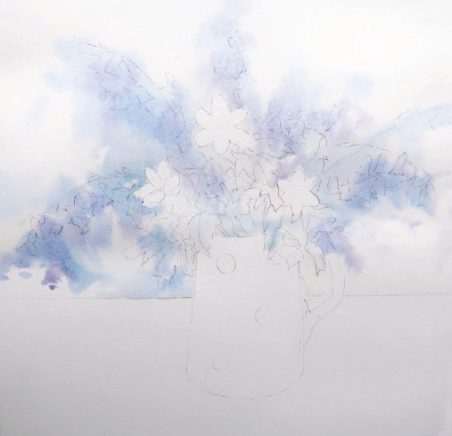 2. Using a No. 12 brush wet around the white flowers to leave them as dry paper and sweep the water to the edge of the painting and to the line of the table.