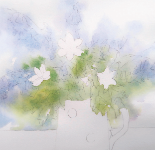 As you will see from my demonstration below, I began by painting the background, applying soft washes of colour on which the greens and purples will sit. This gives the painting cohesion. The overall effect of the painting is a complementary mix of golden yellow and mauve, with green as the balancing colour, connecting the purple and white flowers.