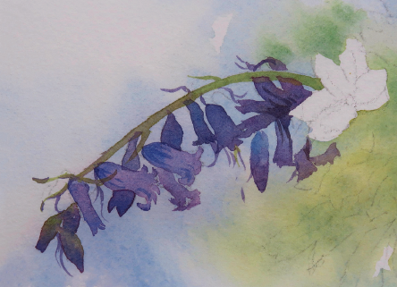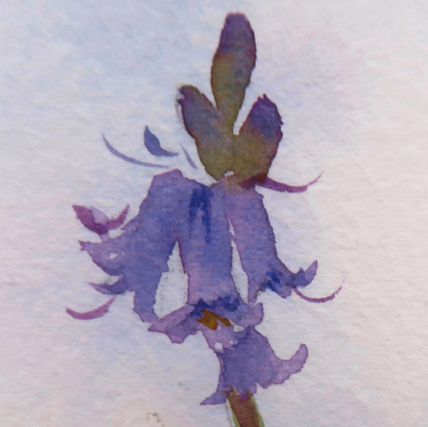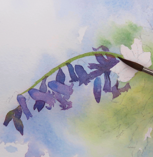 4. Whilst still damp, apply the second mix of soft purple, allowing the colours to merge together, but subtly suggesting the bell shapes. Try to avoid putting purple in the area beneath the foliage.