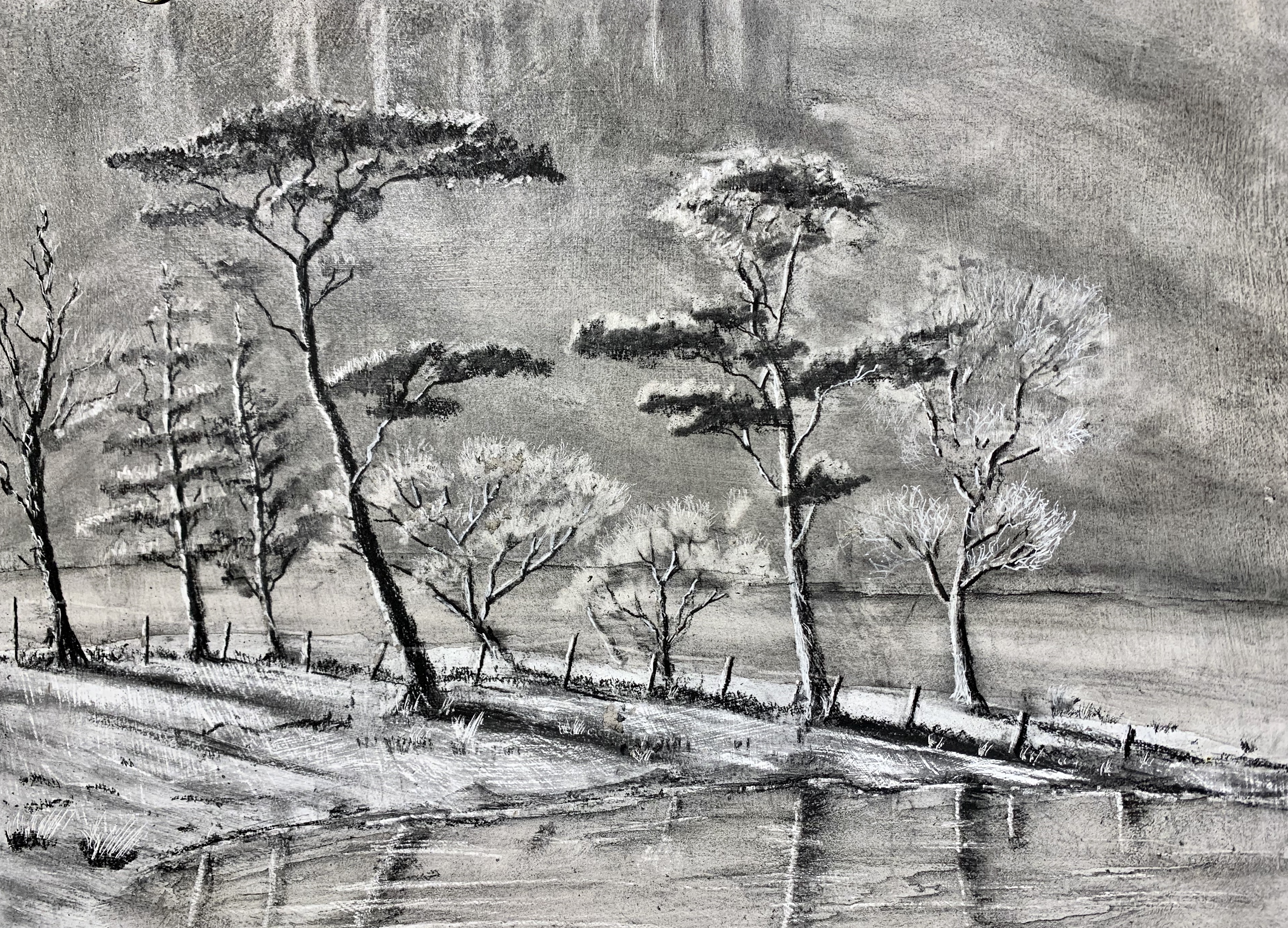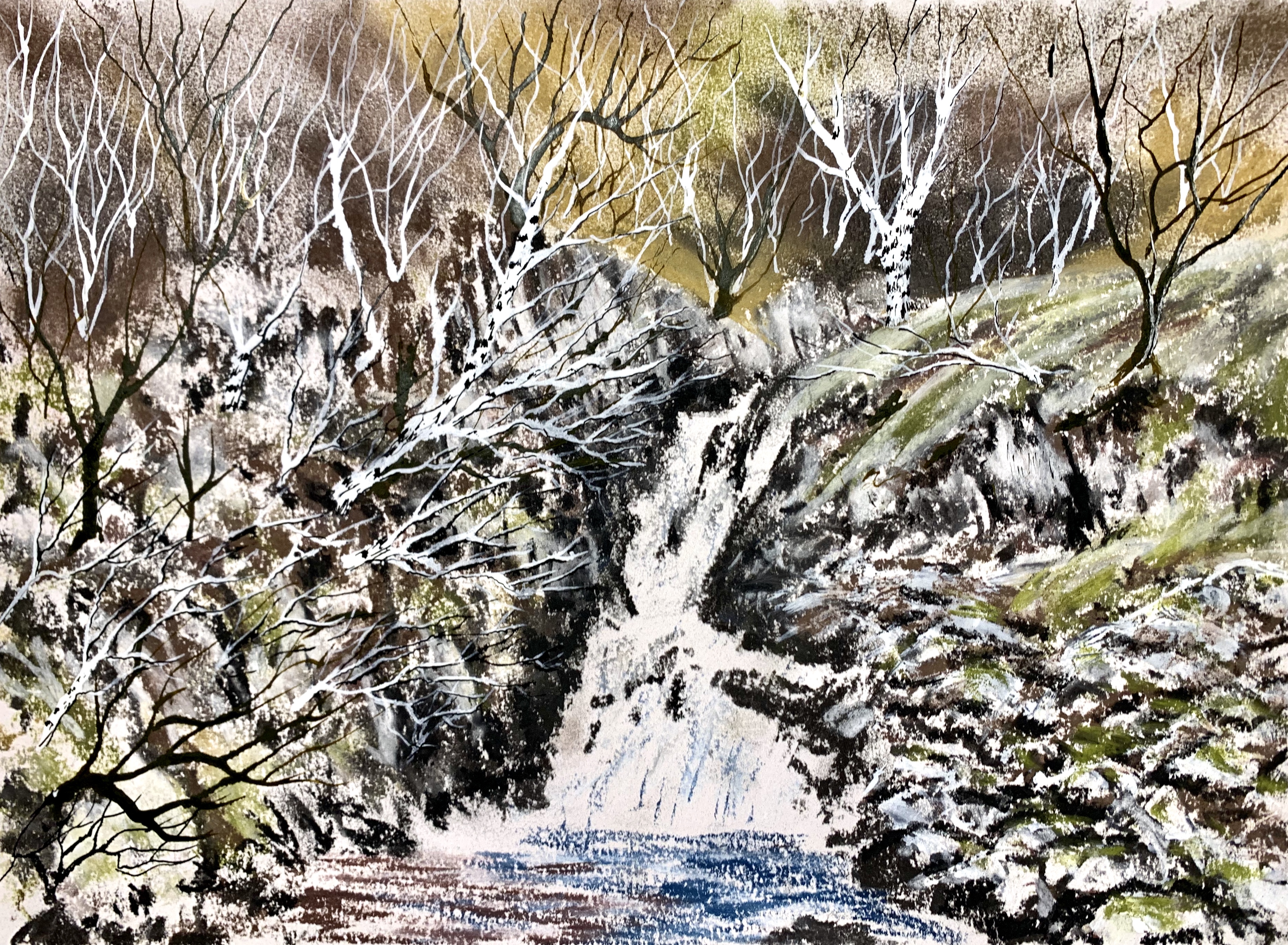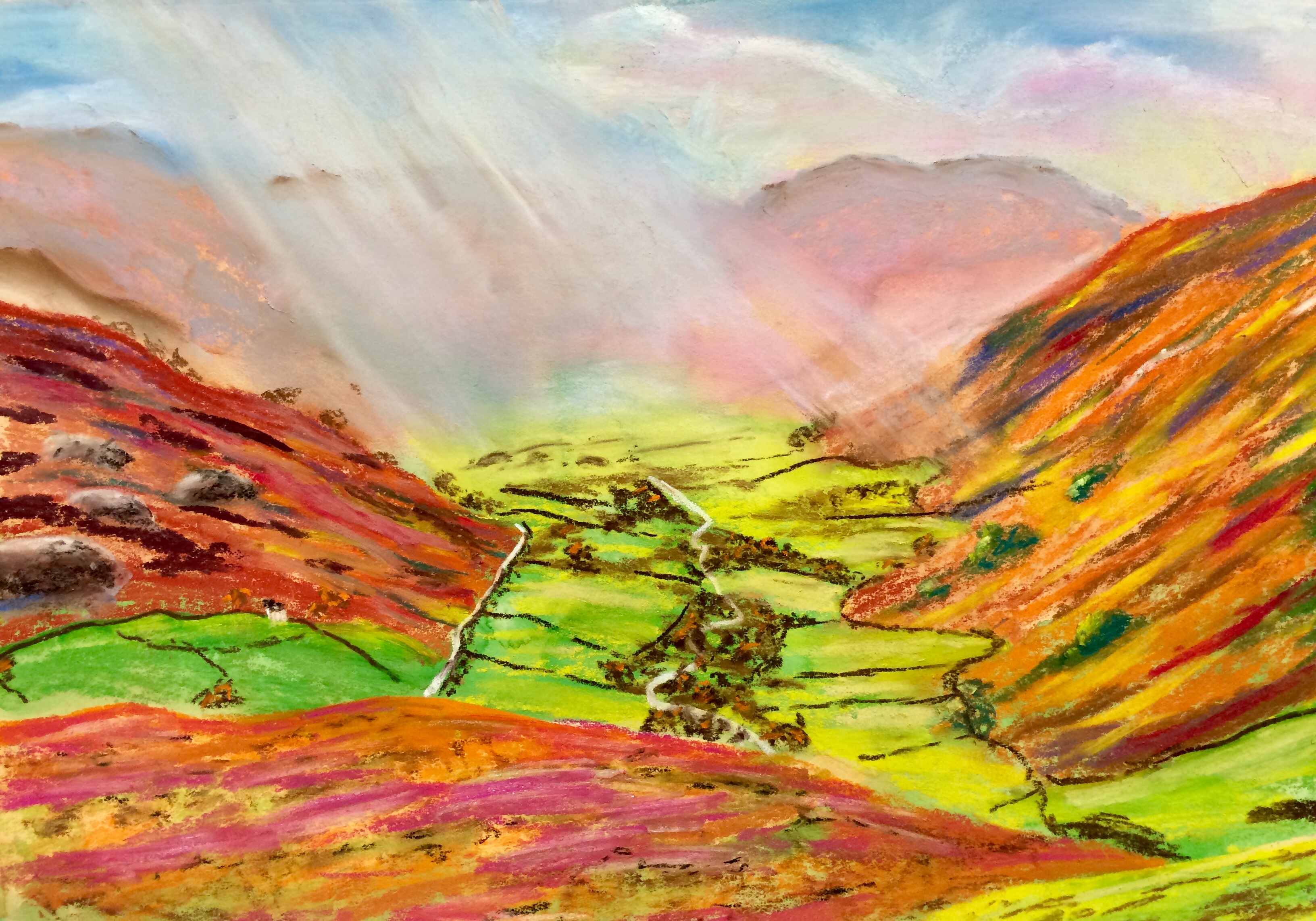 Still some weeks to go before winter, but this weekend’s chilly northerly breeze motivated this pastel painting of a scene in Cumbria’s Eden Valley. Unison soft pastels on A4 Clairefontaine Pastelmat.